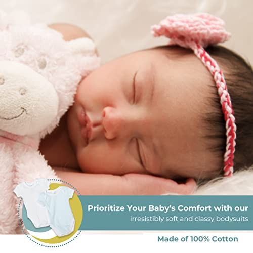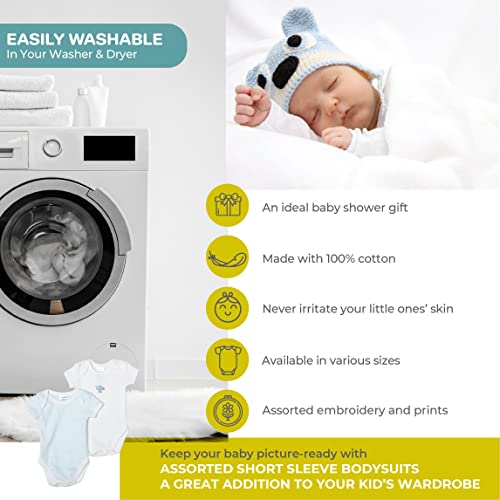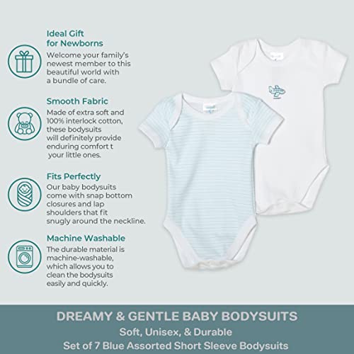 Treat your little one to comfort and style with this pack of seven assorted short sleeve bodysuits. Crafted from 100% soft cotton, these snug fit bodysuits are designed with a convenient lap shoulder neckline and snap bottom closures for easy changing. They come in an attractive shade of blue, perfect for both playdates and picture-perfect moments. This pack is not only cost-effective but also a practical addition to your baby’s wardrobe, ensuring you always have a fresh change at hand. Plus, if you’re attending a baby shower soon, this set makes for an ideal gift. The bodysuits are available in sizes 3, 6, and 9 months and are machine washable. Each one is slightly longer to accommodate for any shrinkage during drying, ensuring a perfect fit every time.