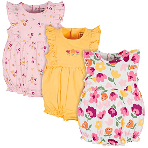 Dress your little princess in this charming 3-pack of baby girl rompers. Each set comes in lovely shades of pink, white, and gold with screen print and puff print art that adds a touch of whimsy. Designed with convenience in mind, these rompers feature inner thigh snaps and a back placket for effortless changes. They’re crafted from soft, breathable cotton fabric, making them perfect for warm weather wear. For those breezy days, simply pair with a cute cardigan and our delightful baby shoes for an outfit that’s as adorable as she is!