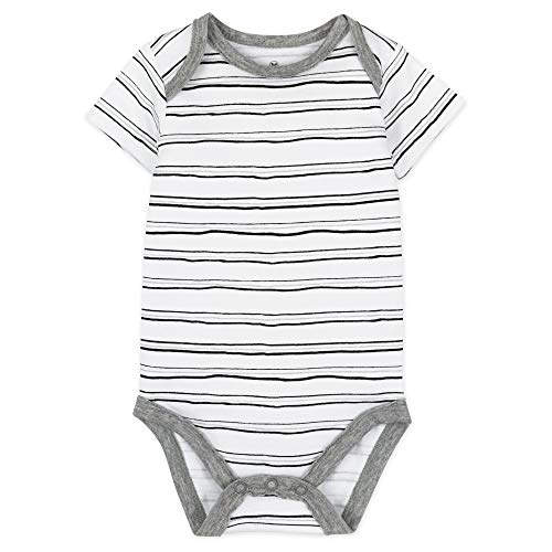 Treat your little one to the gentlest of touches with our set of five short-sleeve bodysuits, designed especially for baby boys. Crafted with 100% organic cotton, these one-piece suits are soft, breathable, and perfect for sensitive skin. Our commitment to sustainability is certified by GOTS, ensuring that each piece is produced without synthetic pesticides, non-toxic, PVC free, and created without heavy metal phthalate dyes. The envelope neck construction and lap shoulder design make dressing and undressing a breeze, while the nickle-free snaps and tagless label ensure ultimate comfort. Finished with premium, raw edge jersey binding to minimize fabric bulk and reduce rub on baby’s delicate skin, these bodysuits combine practicality with style. Pamper your baby with comfort that cares for his skin and the planet too.