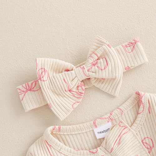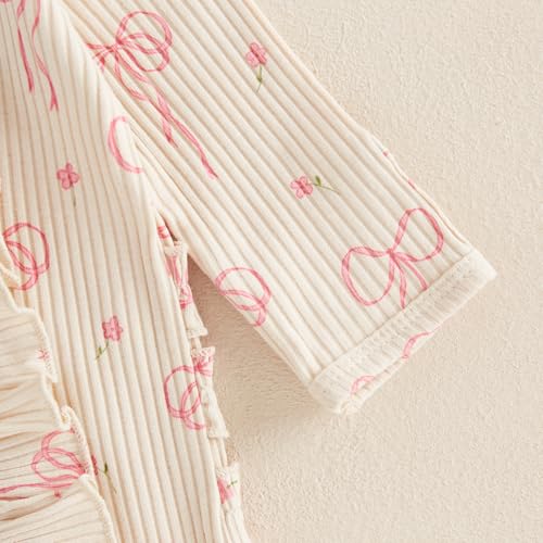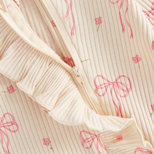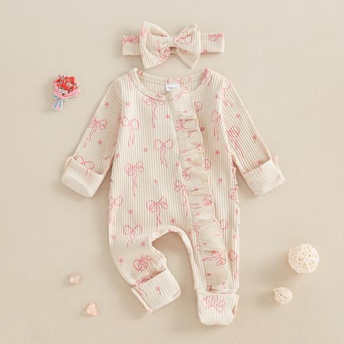Crafted from a blend of 65% cotton and 35% polyester, this baby girl romper provides a soft, skin-friendly, and breathable wear. Perfect for babies aged 0-6 months, this fall outfit features charming details like a round neck, long sleeves, and a ruffle trim. The ribbed detail, full-length design, and front zipper make it practical and comfortable for your little one. An all-over bow print adds a super-cute touch, making this outfit a standout choice. The unconstrained design ensures your baby’s comfort, allowing them to breathe freely. This romper makes a perfect gift for special occasions like Halloween, Christmas, Thanksgiving, Easter, New Year, and birthdays. The package includes one long-sleeve jumpsuit and a matching headband, offering a complete, cute, and casual style for your baby’s daily activities, photo sessions, and special events.