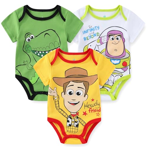 Let your little one embark on a fashion adventure with these adorable 3-pack of bodysuits inspired by beloved animated movie characters. This set contains a cheerful yellow bodysuit featuring a friendly cowboy print, a dynamic green bodysuit with a cuddly dinosaur print, and a sleek white bodysuit adorned with a brave space ranger print. These soft and comfortable bodysuits come in a variety of sizes to accommodate newborns and infants up to 24 months. Perfect for the spring and summer seasons, these bodysuits make an ideal gift for any occasion. Pair them with coordinating accessories to create a captivating ensemble that your child will love!