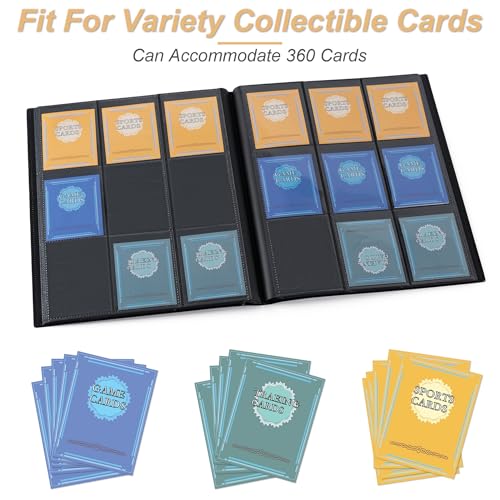 Durable side-loading album holds 360 cards in protective pockets. Compatible with Pokemon, Yu-Gi-Oh, MTG, and other trading card games. Sturdy construction keeps your collection safe and organized.