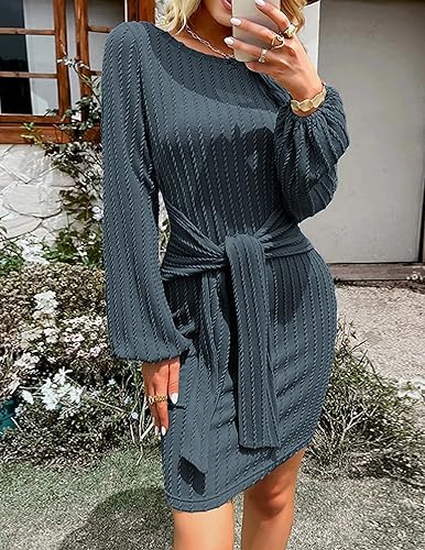 Embrace the cozy warmth of the fall season with this sophisticated women’s knit dress. Crafted from soft, ribbed knit fabric, this dress offers a comfortable and flattering bodycon fit. Its unique design features a stylish crew neck, long lantern sleeves, and a tie waist for that perfect cinched look. The dress reaches knee-length, ensuring a chic and timeless look. Perfect for any occasion, it can be dressed up for a party or formal event, or dressed down for a casual day out. Pair this versatile dress with high heels and your favorite handbag to create a trendy, feminine look. This is not just a dress but a style statement for the modern woman.