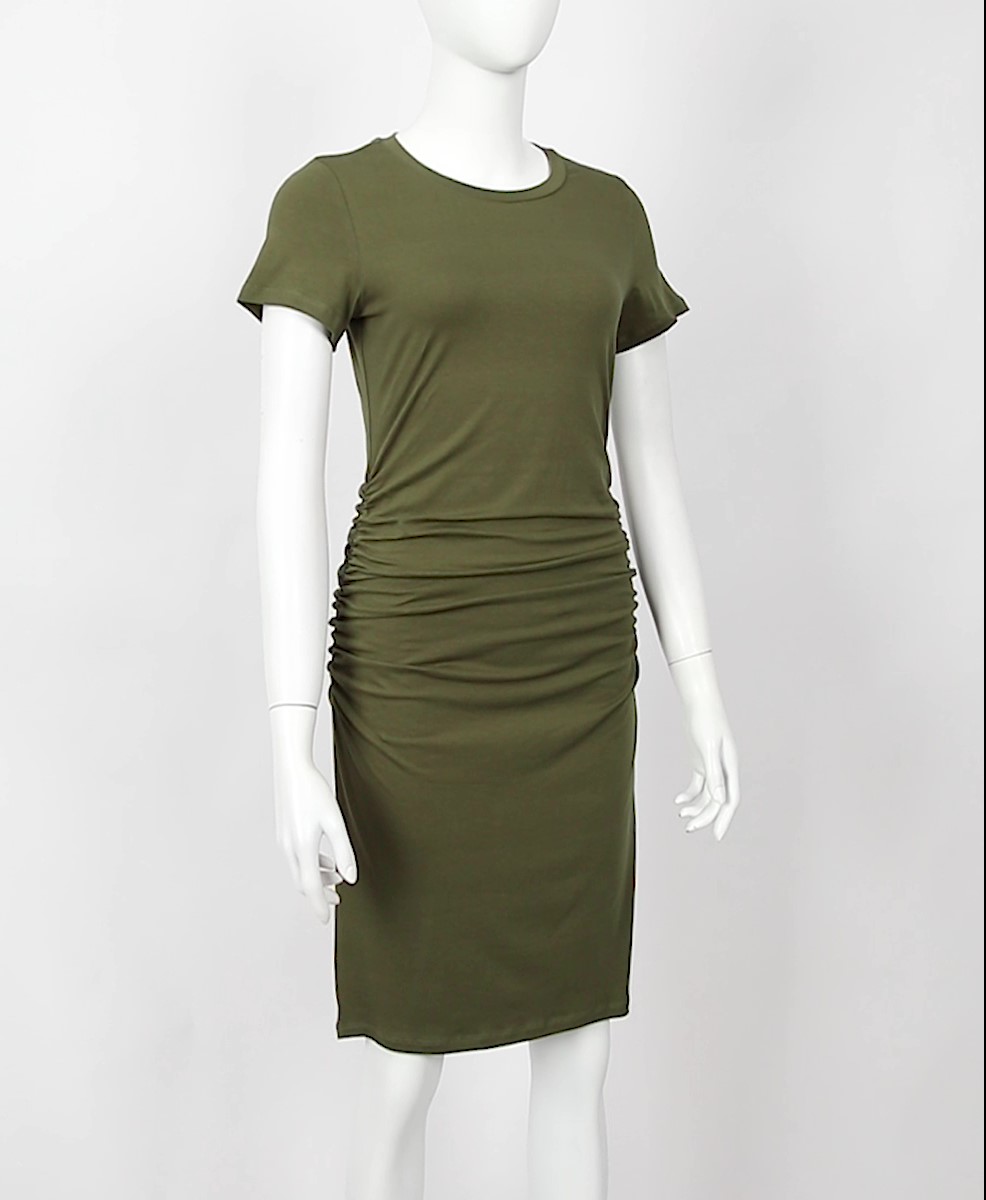 Transform your summer style with our chic, ruched midi bodycon dress! This sleek, short-sleeved sundress is a must-have addition to any wardrobe. Crafted from elastic, breathable fabric, it hugs your body perfectly without feeling too tight, making it a great choice even for expectant mothers. The unique ruched design on both sides and solid color give it a versatile appeal, allowing you to pair it with a variety of fashion items. Whether you’re headed to work, on a date, or out shopping, this dress is your perfect companion. Dress it up with a pair of high heels and a jacket for a more formal look, or keep it casual with flats. Suitable for spring, summer, and autumn, this dress will keep you looking stylish throughout the seasons. Please refer to our size chart to find your perfect fit.