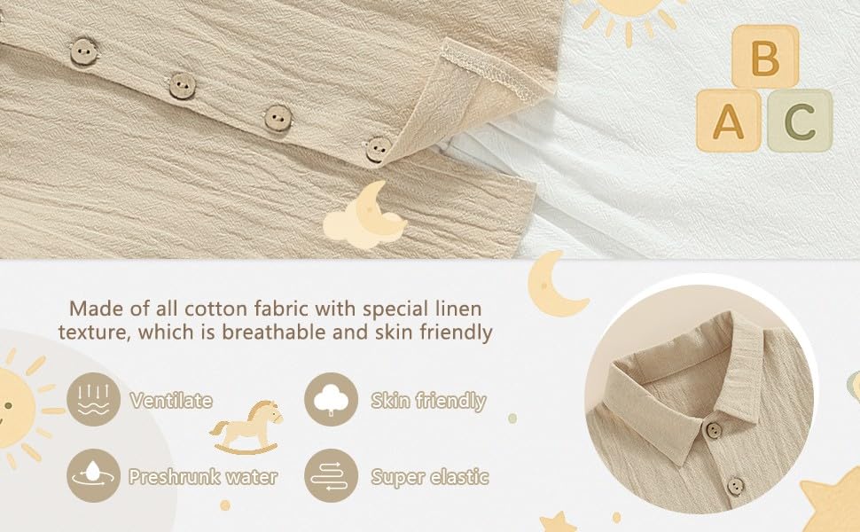 This stylish and comfortable summer outfit set for toddlers is made from premium 100% cotton and has a natural, linen-like texture. The fabric is soft and breathable, designed to keep your little one cool and comfortable all day. The set includes a short-sleeve, V-neck collared button-down shirt and shorts with an elastic waistband and handy side pockets. It’s a versatile outfit, perfect for casual wear, playdates, beach days, poolside fun, and holiday adventures. Pair it with a hat, sunglasses, or a little bag, or let the classic design shine on its own. Easy to care for, this outfit set can be machine washed or hand washed and air dried. For a relaxed, oversized look, consider sizing up. Add this breathable toddler cotton-linen set to your cart now – it’s the perfect outfit for your little explorer!