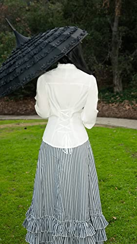 This Victorian-style blouse is a unique blend of elegance and old-world charm. Crafted with an elegant stand collar, front button-down detail, and sheer lace layering, this blouse is sure to make you stand out at any event. The long puffed sleeves and lace-layered cuffs add a playful touch, while the drawstring back design and peplum silhouette refine your look. Wear it to gothic parties, Renaissance festivals, Victorian theme events, or even to the office. It’s also an excellent choice for casual outings or as part of a cosplay outfit. The versatile design pairs well with Victorian A-line skirts, jeans, business attire, or casual wear. Please refer to the size chart in the pictures for accurate sizing and allow 1-2 inch difference due to manual measurement.