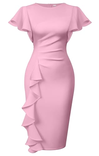 Crafted from a comfortable blend of 90% polyester and 10% spandex, this vintage-inspired Midi Pencil Dress offers a soft and stretchy fit that’s perfect for all-day wear. Its ruffled short sleeves add a charming touch, while the ruched bodycon style accentuates your figure. The unique ruffle detail on the left side creates an illusion of a slimmer physique. It’s a versatile piece that can be worn for a variety of occasions – from church services and business meetings to cocktail parties and weddings. Available in US sizes from 4 to 22, there’s a perfect fit for everyone. For care, simply hand wash or machine wash in cool water, then hang to dry. Add this elegant piece to your wardrobe and make every day a special occasion!