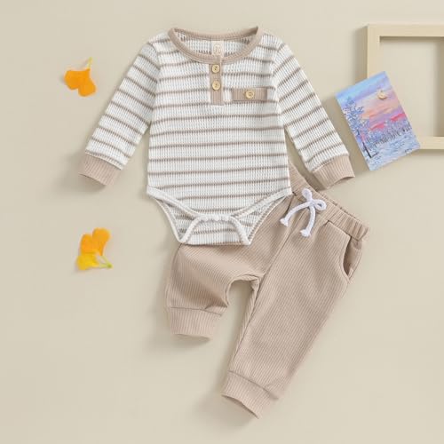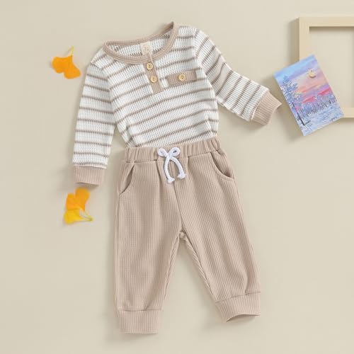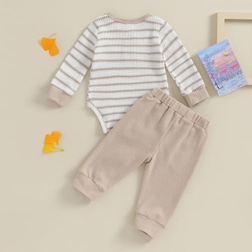 Pamper your little one with our high-quality baby boy outfit set, expertly tailored from a premium cotton blend for ultimate comfort. This ensemble is designed to be breathable, exceptionally soft, and gentle on your baby’s skin. It showcases a classically chic striped long-sleeve onesie, coupled with solid pocket pants, making dressing and diaper changes a breeze!