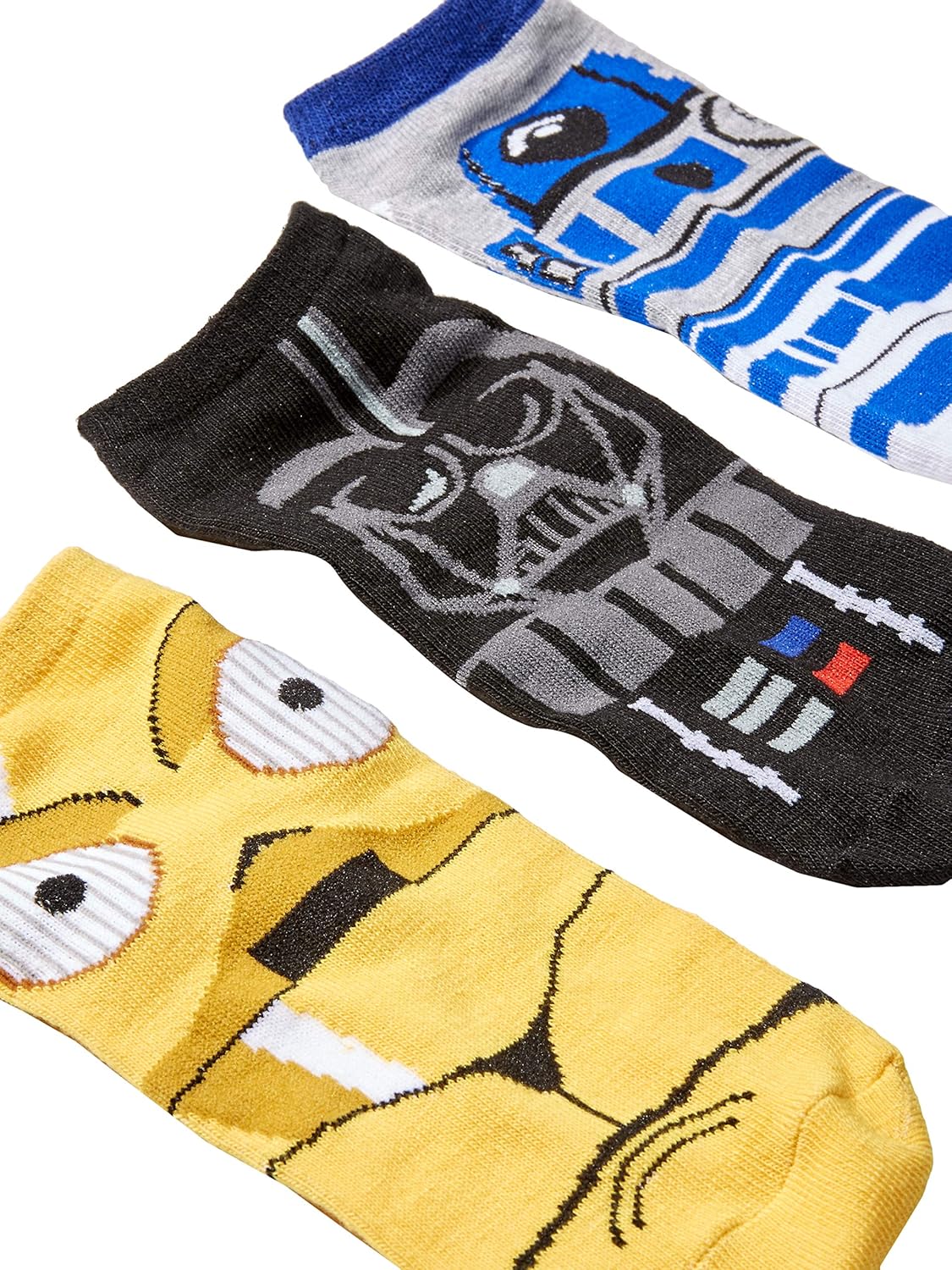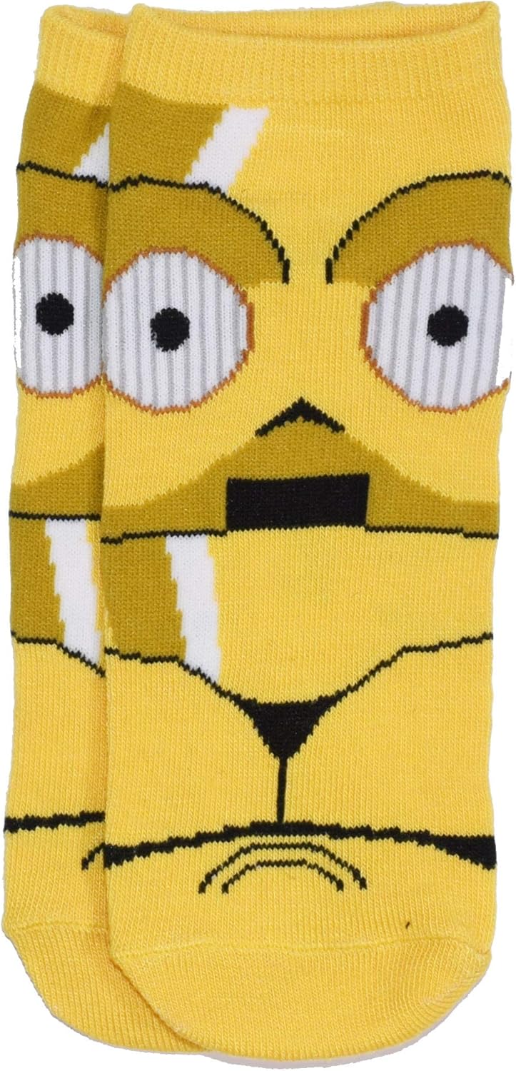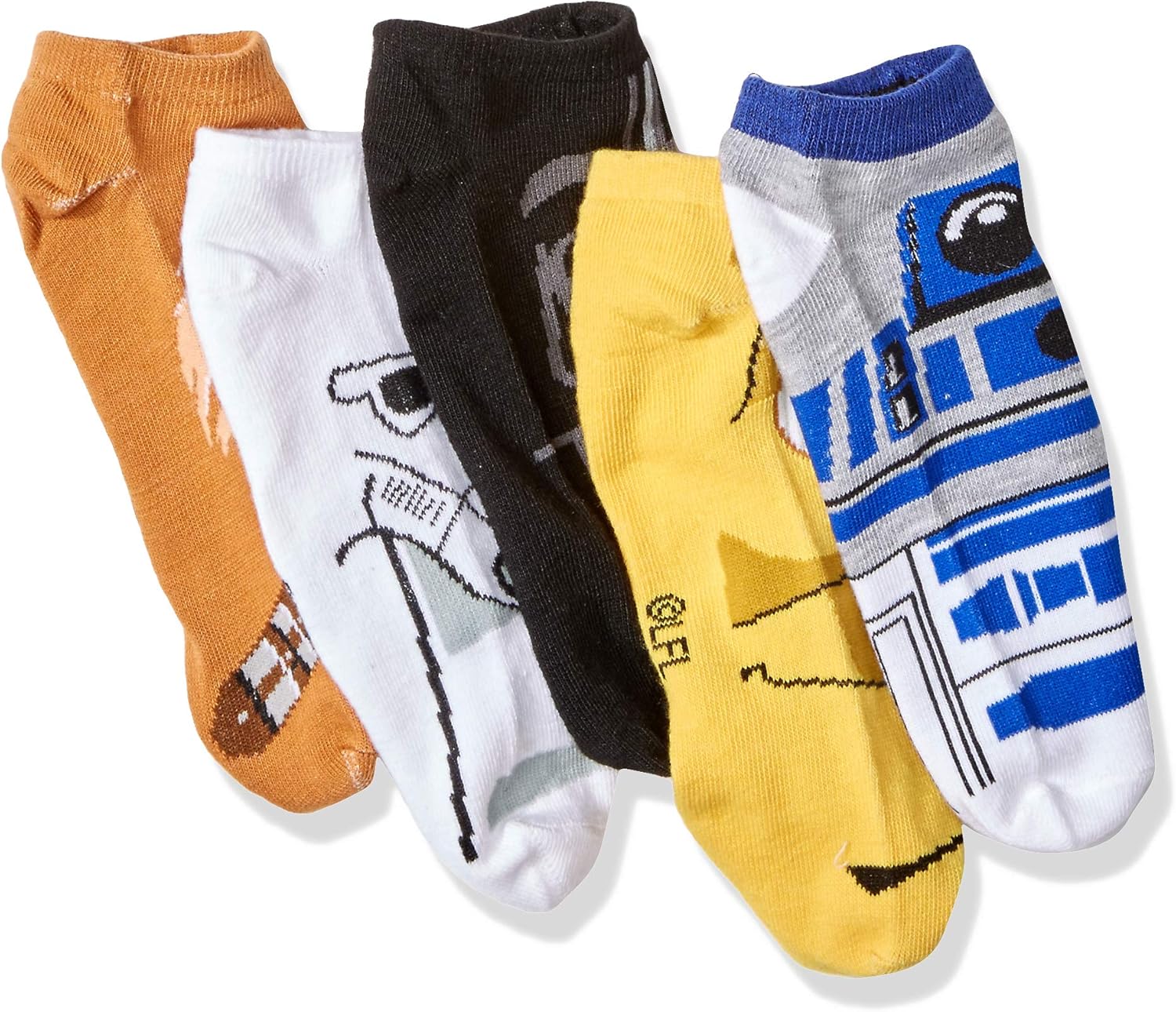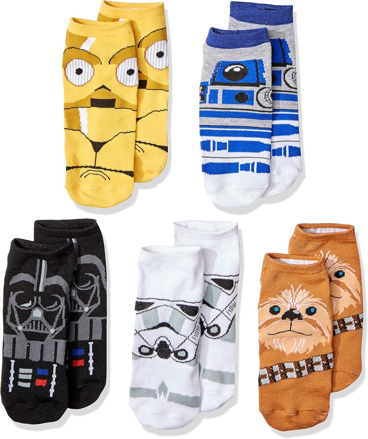 5-pack of ankle socks featuring Chewbacca, Darth Vader, and R2-D2. Fun and comfortable everyday wear for Star Wars fans.