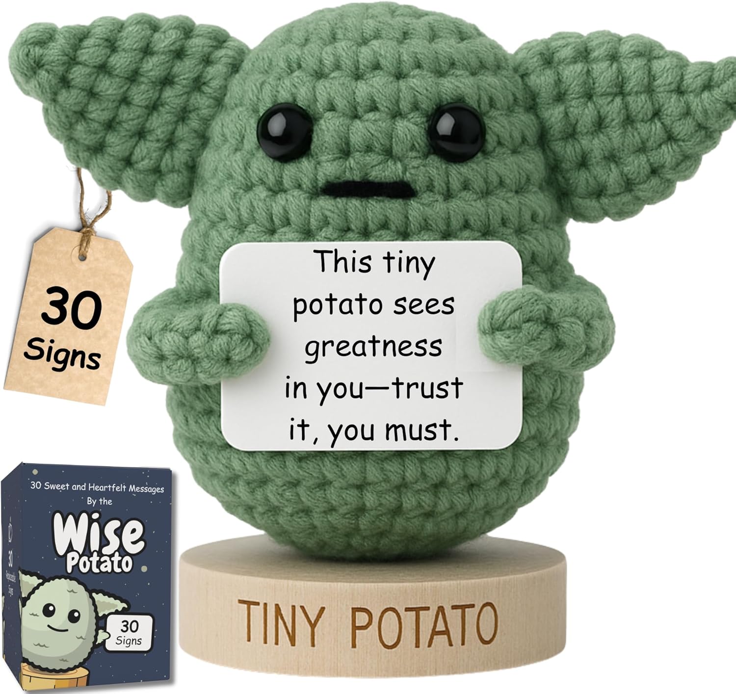 Adorable handmade crochet Baby Yoda figurine bundled with 30 positive affirmation cards. A thoughtful and unique gift for Star Wars fans of all ages.