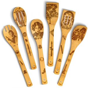 Eco-friendly wooden kitchen utensil set for Star Wars fans. Includes heat-resistant spatulas and spoons safe for non-stick cookware.
