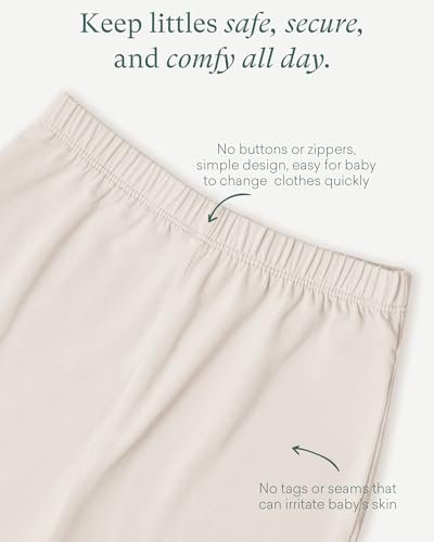 The clever design ensures easy dressing and changing with a stretchy elastic waist and cuffs, eliminating the fuss of buttons or zippers. The pants are available in versatile sizing options from 0-24 months, and the unisex color design ensures a timeless elegance suitable for both boys and girls.