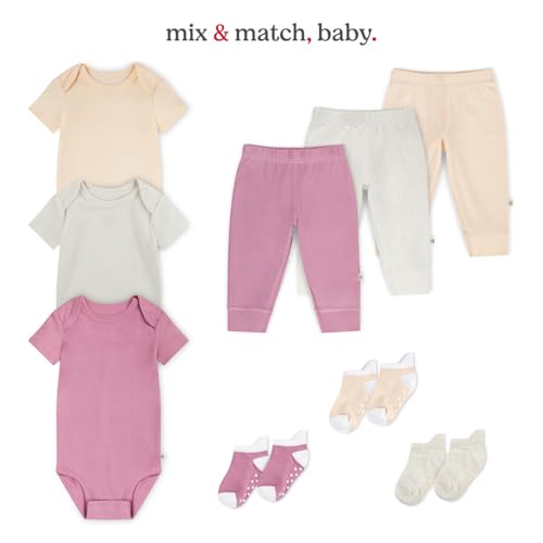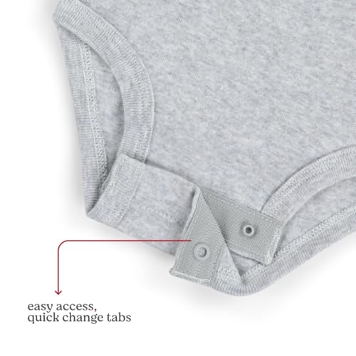 Dress your little one in comfort and style with these unisex baby bodysuits. Crafted from skin-friendly organic cotton, the bodysuits feel delightfully gentle against your baby’s delicate skin. The easy-change design, featuring lapped shoulders and a snap-tape crotch, ensures hassle-free dressing and diaper changes. This pack includes six bodysuits in a variety of charming colors and prints, providing multiple outfit options for your precious little one.