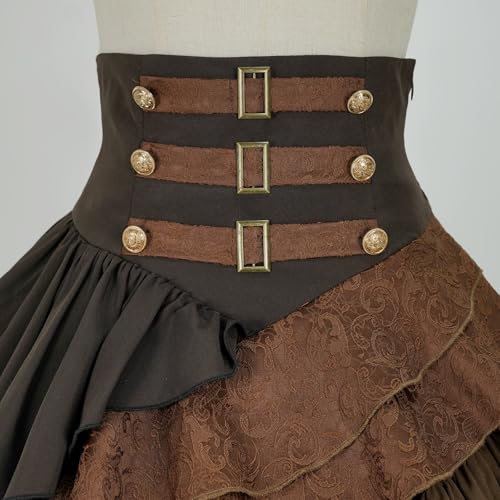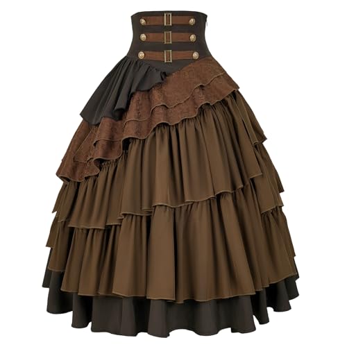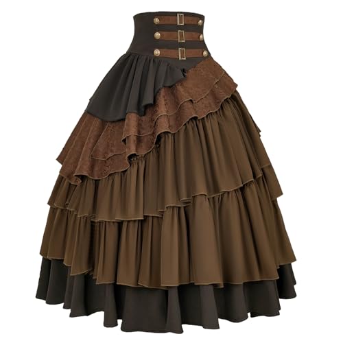 This high-waisted Steampunk skirt is a wardrobe must-have for any lover of unique fashion. Crafted from high-quality polyester, the skirt boasts a layered ruffle design that offers a flattering silhouette and a splash of vintage charm. To achieve the voluminous look seen in the images, pair it with a crinoline beneath. Whether you’re dressing up for a Steampunk party, Halloween, Renaissance fair, or a theatrical performance, this skirt is the perfect choice. It’s also versatile enough for casual daily wear, making it a great addition to any outfit. Available in a range of sizes, it’s designed to accommodate various body types. Please refer to the size chart for the perfect fit. Dress up and step back in time with this fantastic vintage-inspired skirt.